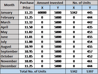Cost averaging is investing a fixed amount on a regular basis for a long-term to take the advantage of the market cycle. As the investment amount is fixed, more units are purchased when price is low and fewer when price is high. Suppose, x invested BDT 60,000 at a time, while y invests the same amount but in an installment of BDT 5,000 every month for a year. The table below illustrates how their investment would behave: