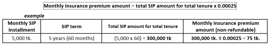The insurance premium amount is BDT 25 per month per 1 lakh taka SIP size.